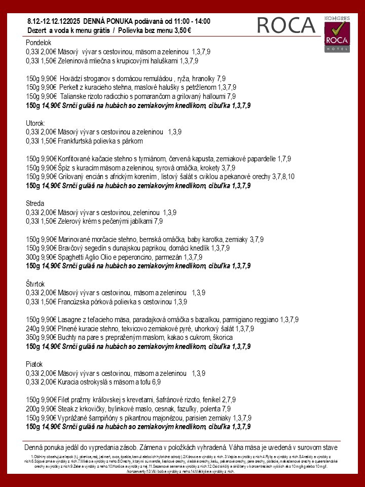 | Sobota | 11:30 - 20:00 Zmeny si vyhradzujeme podľa potreby |