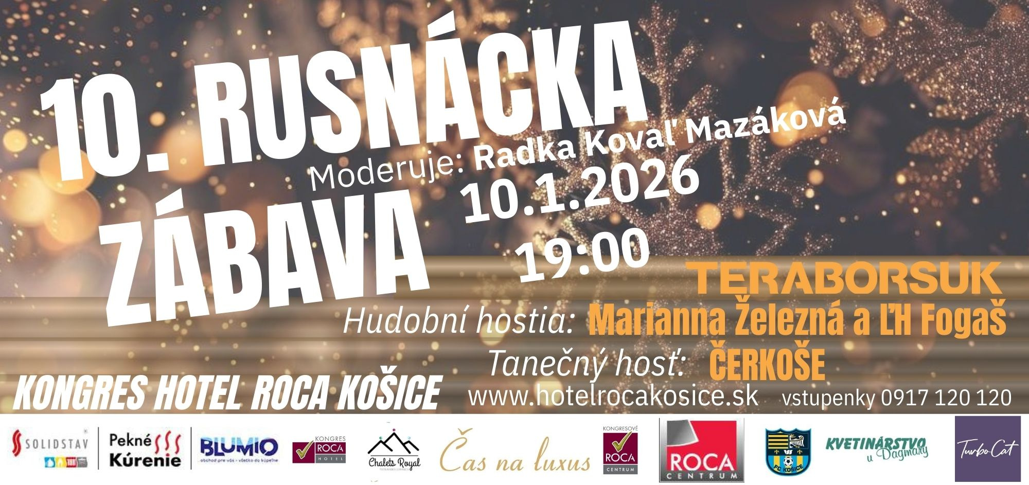 Pretancujte s nami noc pri príležitosti 10. výročia Rusnáckej zábavy, večer plný tanca, spevu, zábavy a skvelého jedla je opäť tu - prvý krát v novom KONGRESOVOM CENTRE ROCA. Večer moderuje skvelá Radka Kovaľ Mazáková. Hudobní hostia večera: TERABORSUK, MARIANNA ŽELEZNÁ a ĽH FOGAŠ, tanečný hosť - ČERKOŠE, DJ Julo Hrabušický, tombola venovaná charitatívnemu účelu.